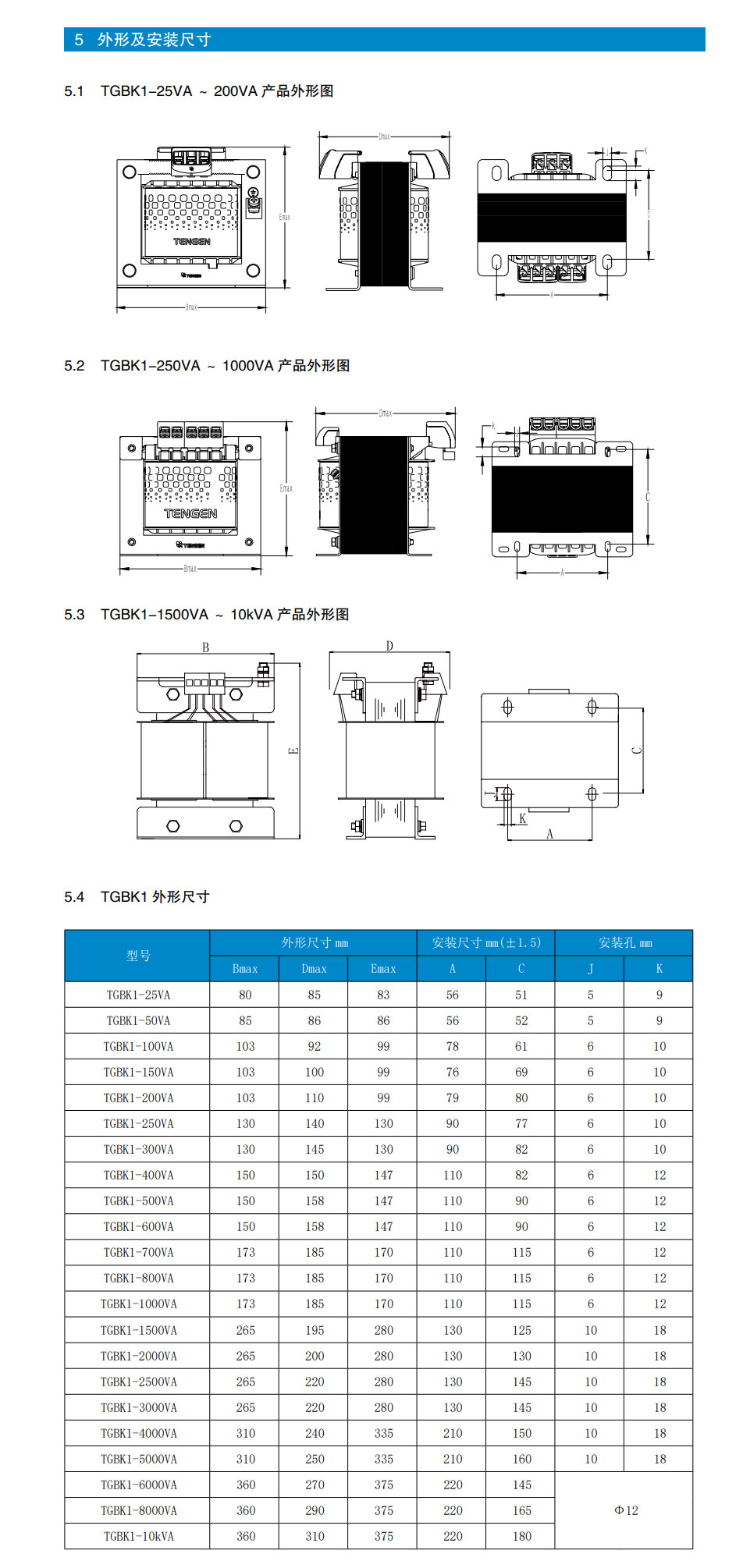 TGBK1 型系列控制变压器(以下简称变压器),适用于交流50/60Hz,额定电源电压不超过660V(660V 以上电压可协商定制)的交流电路中,作为机床和机械设备中的控制电源,工作照明、电子设备及信号灯电源;也可作为小型动力电源使用。